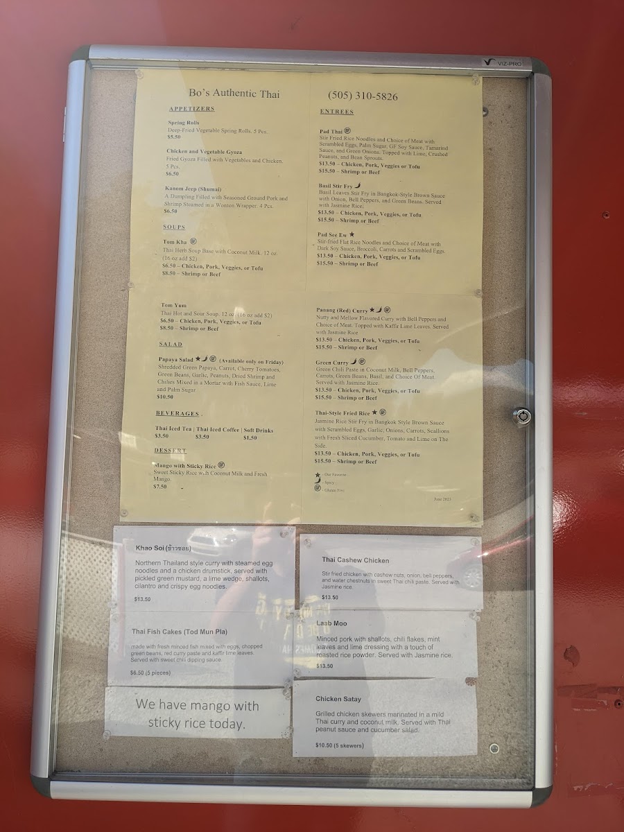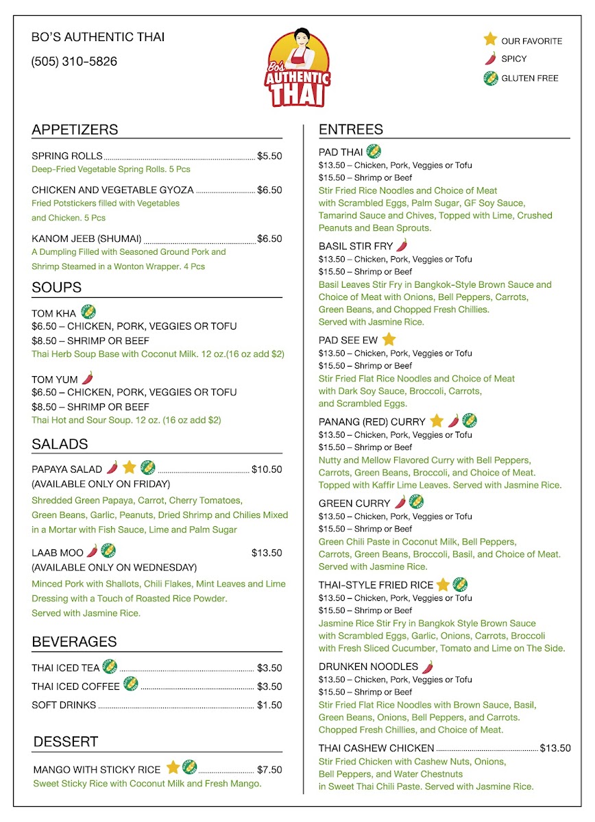 Overall, the menu at Bo’s Authentic Thai offers a well-rounded and satisfying selection that captures the essence of traditional Thai cuisine at approachable prices. The appetizers, including Spring Rolls, Chicken And Vegetable Gyoza, and Kanom Jeeb, provide a flavorful start, while comforting soups like Tom Yum and Tom Kha add a rich, aromatic touch. Fresh and vibrant options such as Papaya Salad and Laab Moo balance the menu nicely, leading into hearty entrées like Basil Stir Fry, Pad Thai, Pad See Ew, Panang (Red) Curry, and Green Curry, each delivering bold, authentic flavors. Specialty dishes such as Khao Soi, Thai Fish Cakes, Thai Cashew Chicken, and Chicken Satay further showcase the kitchen’s range and attention to traditional recipes. To round out the experience, beverages like Thai Iced Tea, Thai Iced Coffee, and Soft Drinks pair well with the dishes, while the classic dessert Mango With Sticky Rice provides a sweet and satisfying finish. Altogether, the menu feels thoughtfully curated, offering both familiar favorites and distinctive specialties that leave a lasting impression.